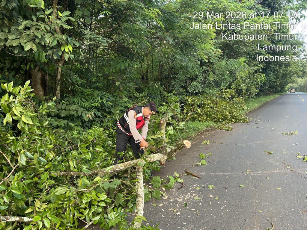 Respon cepat ditunjukkan oleh Personel Unit Patroli Sat Samapta Polres Lampung Timur dalam menangani dampak hujan lebat yang terjadi pada hari Minggu (29/3/26) sekitar pukul 17.00 WIB. Hujan dengan intensitas tinggi tersebut menyebabkan sebuah pohon tumbang dan menutup akses jalan di Jl. Raya Lintas Timur, Kecamatan Sukadana, Kabupaten Lampung Timur.